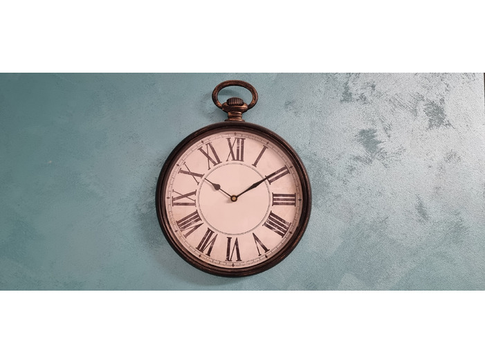 Vând ceas de perete cu design inspirat de ceasurile de buzunar clasice. Are cifre romane mari, ramă cu aspect antichizat (bronz patinat) și un aer rustic, perfect pentru decoruri vintage, shabby chic, industrial sau clasice.