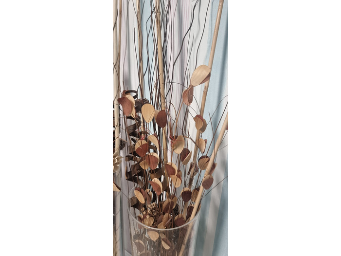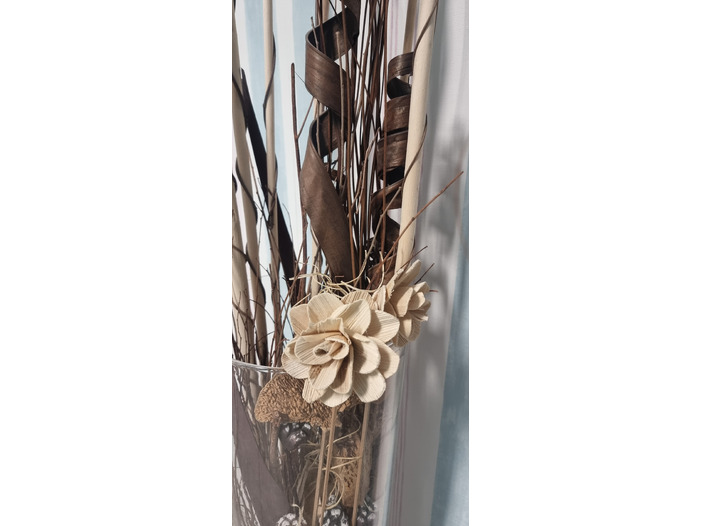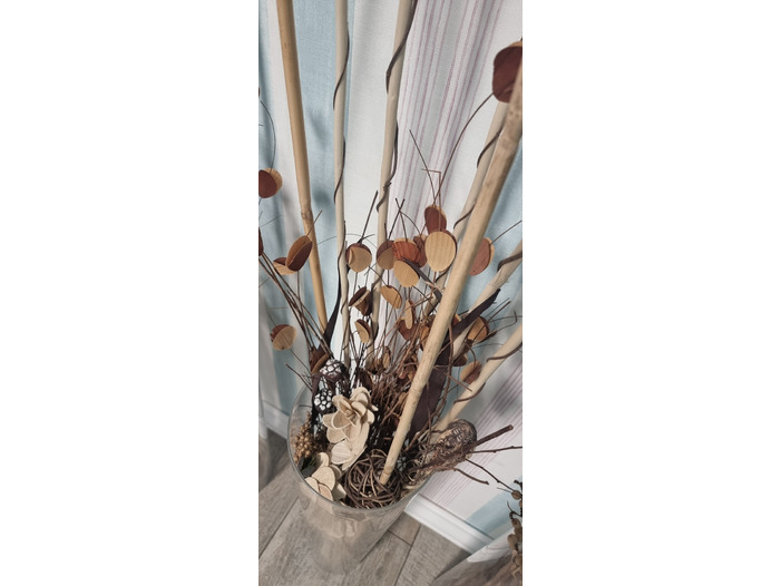Adaugă o notă de eleganță și natură în orice colț al casei tale cu această Vază din sticlă transparentă cu aranjament floral decorativ. Conținutul include o selecție armonioasă de elemente naturale uscate: flori artizanale, bețe decorative, spiralate și rotunde, frunze din lemn și detalii rustice – totul perfect echilibrat pentru a crea o atmosferă caldă și primitoare.