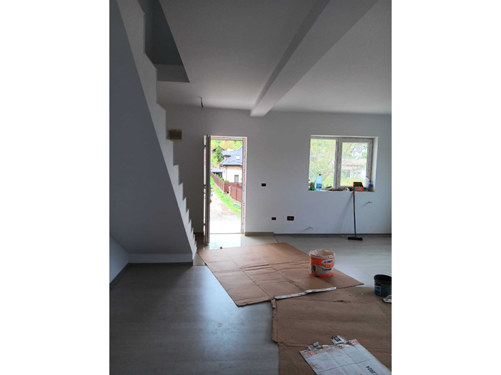 -Parter = Living, baie, bucatarie (cu iesire pe terasa din spatele casei), scara interioara.
